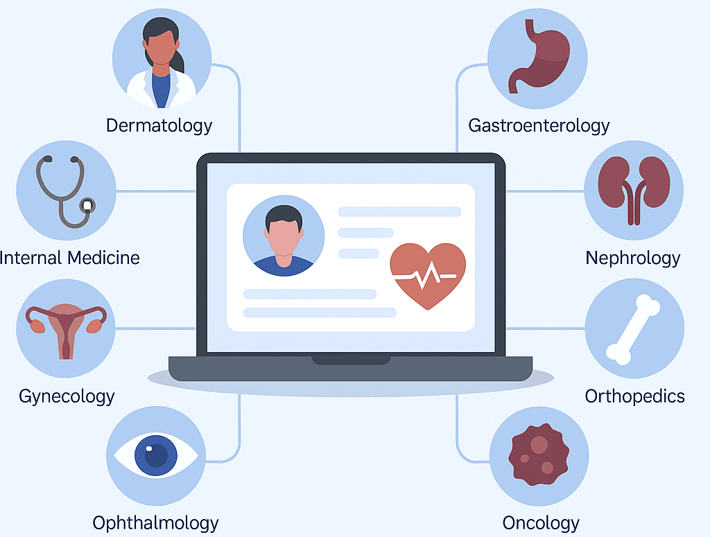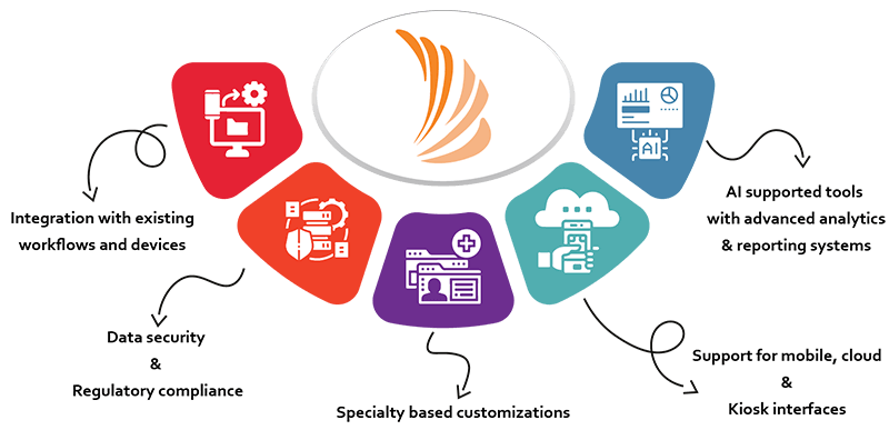 This section highlights the system's ability to provide customized solutions tailored to specific specialties or departments. Whether it's cardiology, radiology, or general practice, the platform adapts to unique needs and workflows for better usability.